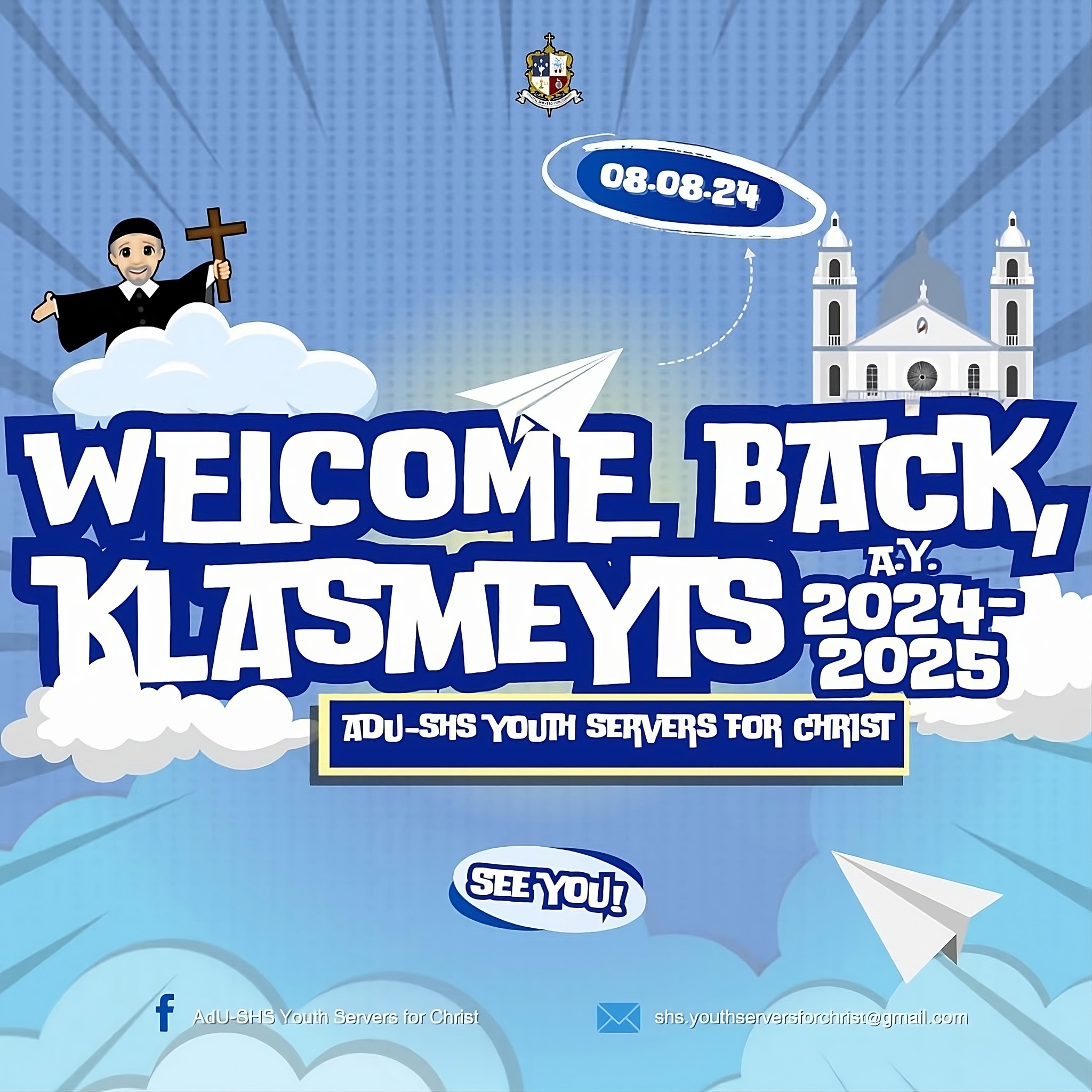 Hi, Klasmeyts! Adamson University officially welcomes you back for another exciting school year, starting today, August 8, 2024. Whether you’re a returning student or a fresh face, the AdU-SHS Youth Servers for Christ will be your co-pilots as you soar through new academic horizons. ๐Ÿ‘จโ€โœˆ๏ธ๐Ÿ‘ฉโ€โœˆ๏ธ